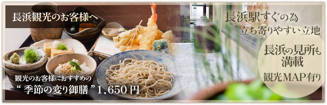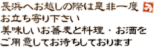 澄んだ空気や水・・・といった恵まれた環境の土地、長浜で精魂込めて打つ蕎麦を、是非一度ご賞味頂きたい。